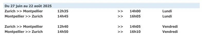 Swiss International Air Lines opérera deux fois par semaine, les lundis et vendredis du 27 juin au 22 août 2025, sur des appareils bi-classes (affaires et économique). Thadée Nawrocki, ‘General Manager Sales’ France & Luxembourg de Lufthansa Group déclare : « Avec la nouvelle liaison entre Zurich et Montpellier, nous offrons à notre clientèle la possibilité de rejoindre rapidement et confortablement l’une des régions les plus attrayantes de France. En parallèle, cette liaison donne, aux passagers embarquant à Montpellier, un accès optimal à des destinations dans le monde entier grâce à notre hub de Zurich ».