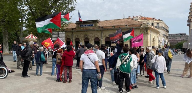 À Montpellier, ils sont des dizaines à s’être rassemblés ce samedi 11 avril à proximité de l’Office de tourisme afin de protester contre la loi Yadan, qui doit être examinée les 16 et 17 avril prochains à l’Assemblée nationale. « Cette loi intervient dans un contexte où le mouvement de solidarité avec le peuple palestinien est déjà largement criminalisé et où la Knesset [Parlement israélien, ndlr] a voté une loi autorisant la peine de mort contre les Palestiniens », déplore Ibtissame.