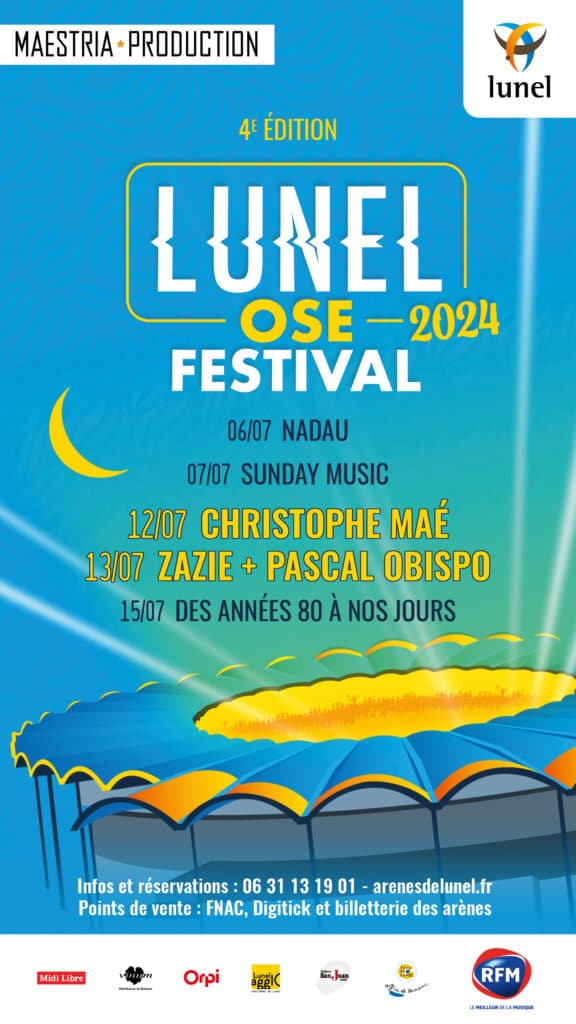 Notez que le Lunel Ose Festival 2024 débutera dès le 6 juillet avec Nadau puis le 7 juillet, aura lieu la Sunday Music. Le Festival se terminera cette année le 15 juillet avec un grand concert « Des années 80 à nos jours ».