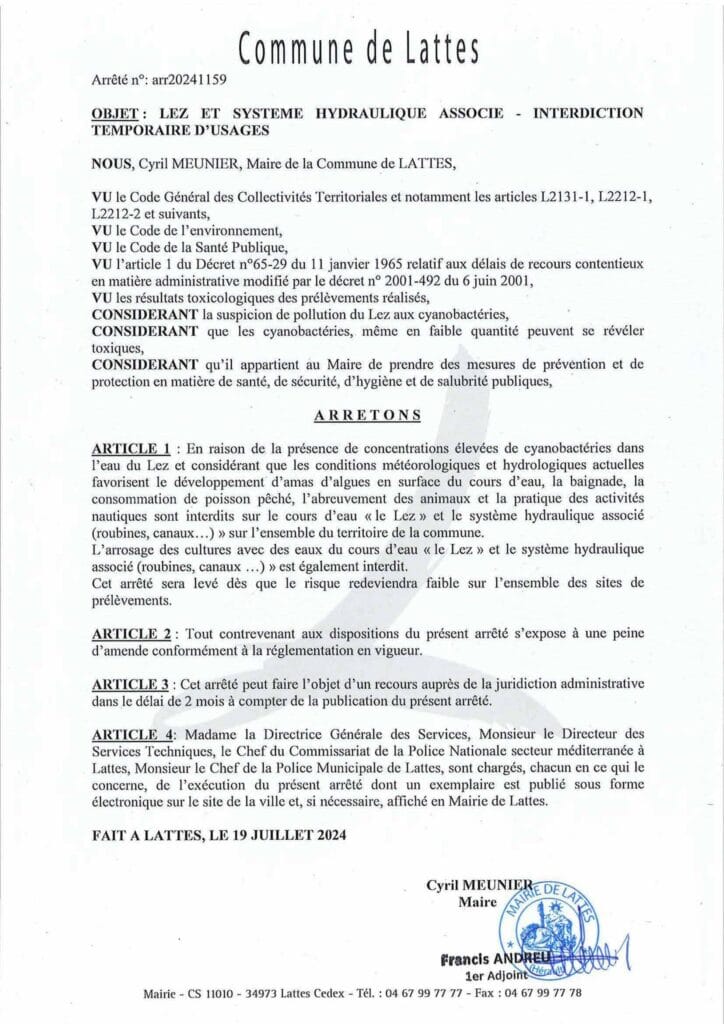 Après le décès d’un chien dû à la présence de cyanobactéries dans un étang de Pérols, c’est au tour du Lez d’être contaminé, notamment aux abords de la commune de Lattes. De plus, les conditions météorologiques et hydrologiques récentes contribuent au développement d’amas d’algues en surface. Par conséquent, la Ville a été contrainte de prendre un arrêté municipal afin d’interdire de nombreux usages de l’eau afin de protéger la population. Sont interdits jusqu’à nouvel ordre :