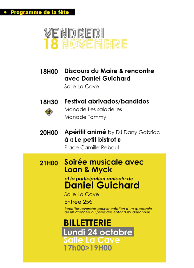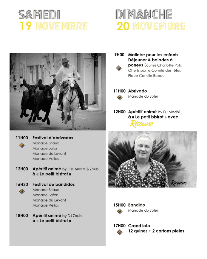 Festivals d’abrivados, de bandidos pour samedi 19 novembre. Matinée pour les enfants et balades à poney dimanche. Programme très chargé et il y en aura pour tout le monde ! Apéritifs animés par des DJs reconnus, et à ne pas manquer, la présence de RICOUNE dimanche midi. Un grand loto aura lieu à 17h00 le dimanche 20 novembre. Découvrez le programme détaillé ci-dessous :