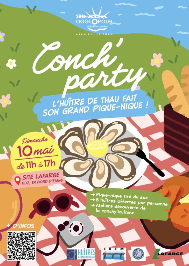Au programme de la Conch’Party : un pique-nique participatif, où chacun rapportera son repas avec la possibilité de le compléter sur place avec des spécialités locales et des produits de vignerons locaux. Suite aux évènements de l’hiver ayant durement touché les conchyliculteurs, la Conch’Party a pour objectif de leur apporter un soutien, tout en mettant à l’honneur leur savoir-faire. Huit huîtres seront donc offertes à chaque participant, pouvant par la suite en acheter d’autres à déguster sur place ou à emporter. La Conch’Party proposera également des ateliers pédagogiques pour découvrir l’ostréiculture ainsi que des animations pour les enfants. Une ambiance musicale festive sera assurée par une peña. À noter que des tables et des bancs seront installés sur place, mais les participants sont tout de même invités à apporter nappe ou plaid pour s’installer confortablement
