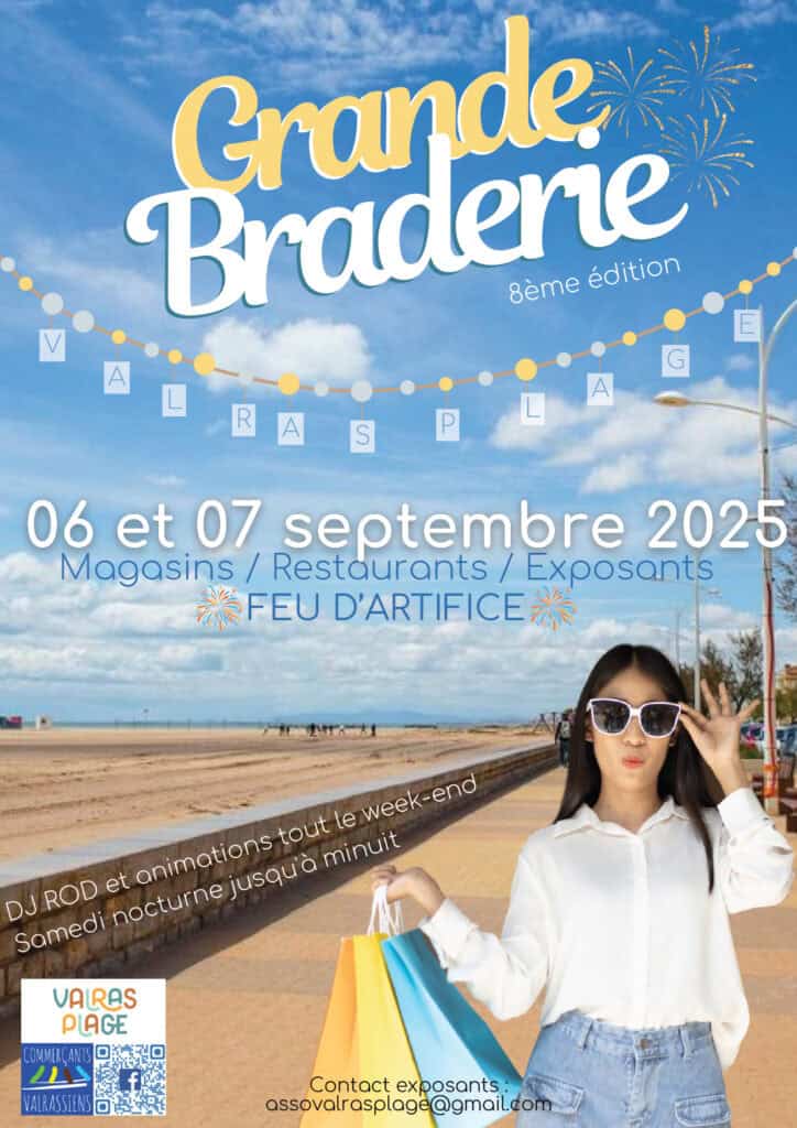Pour sa 8ᵉ édition, l’association des commerçants valrassiens vous invite à deux jours de bonnes affaires et d’animations en bord de mer. Mode, accessoires, déco, gourmandises… Il y en aura pour tous les goûts à l’occasion de « La Grande braderie des Commerçants » à Valras-Plage. Rendez-vous les samedi 6 et dimanche 7 septembre 2025 dès 9h, sur le front de mer. Nouveauté cette année, un feu d’artifice sera proposé au public le samedi 6 septembre en soirée ! Suivre les dernières actualités de l’association, cliquez ici. Affiche officielle ci-dessous :