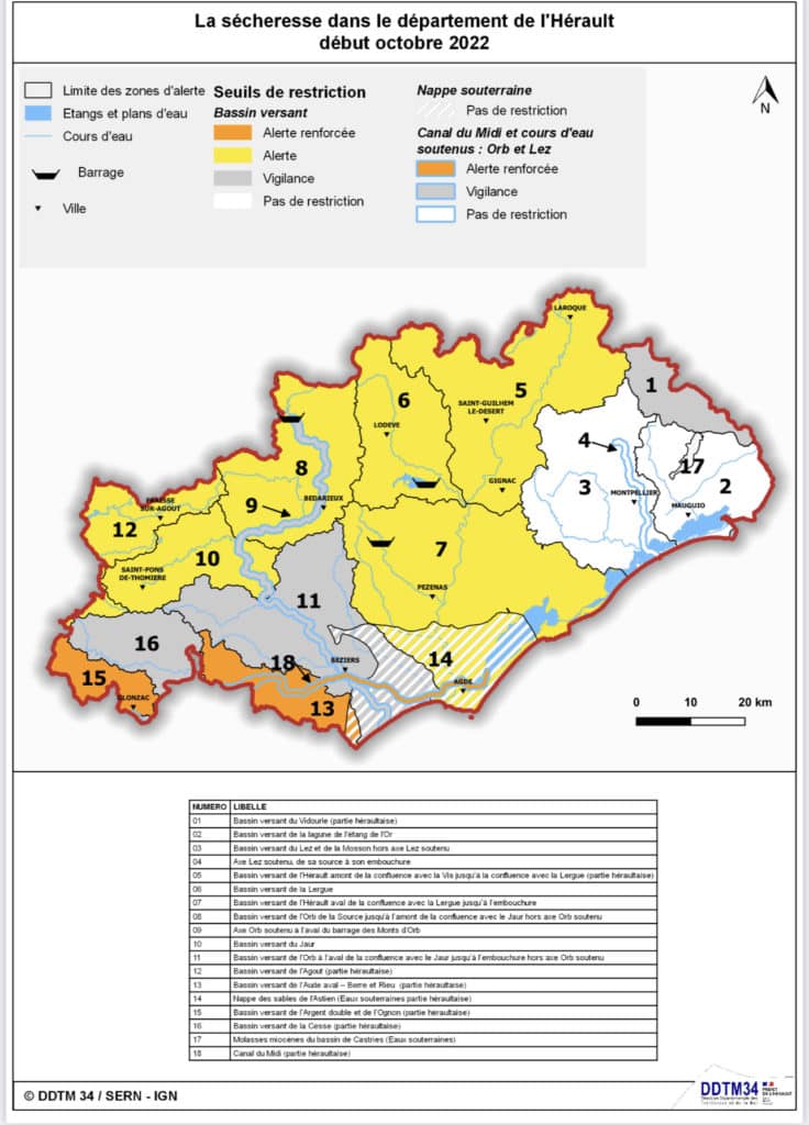 Dans ce contexte, sur proposition du comité départemental de suivi de la ressource en eau, le Préfet de l’Hérault a pris les décisions suivantes.