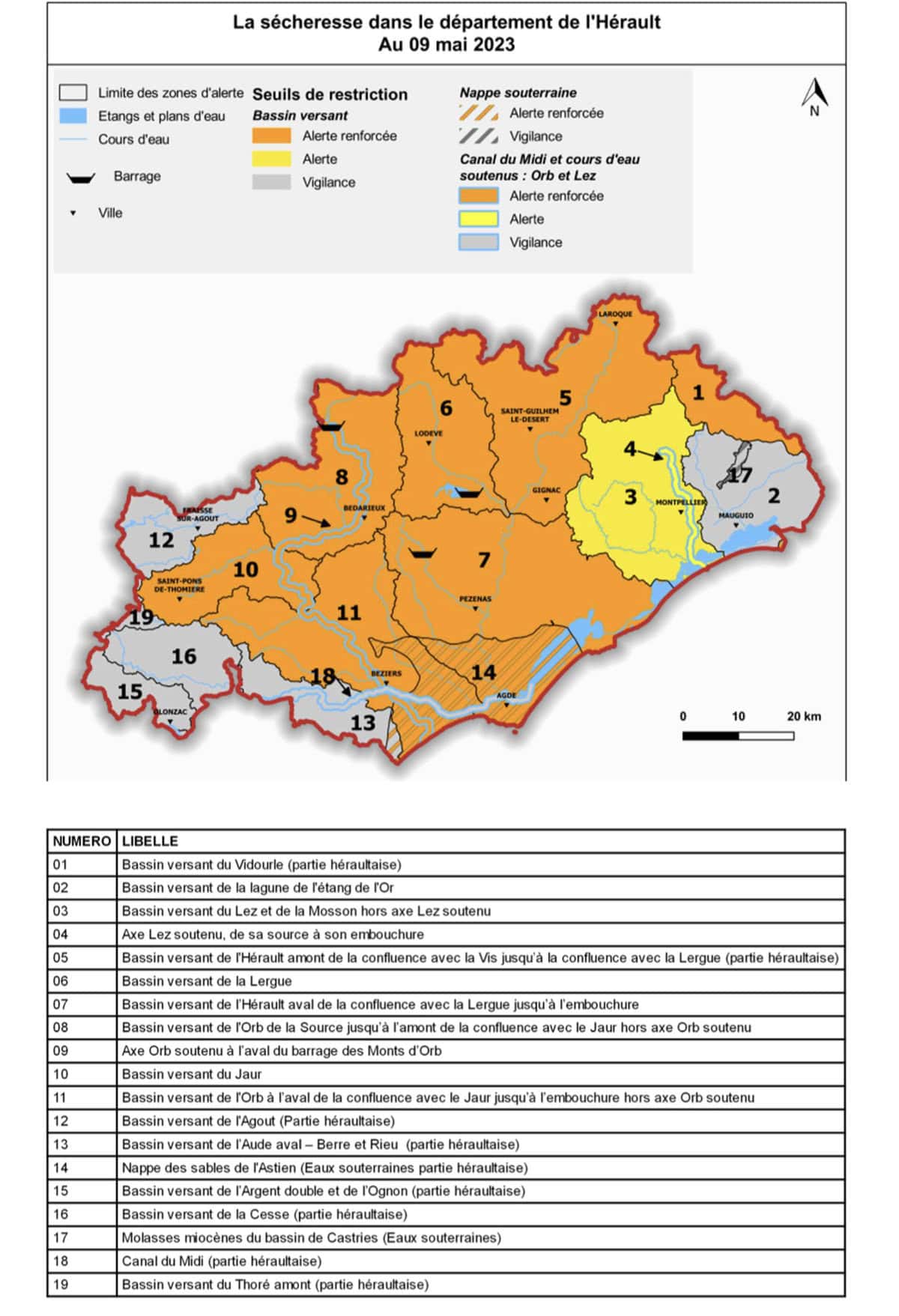 – le passage en alerte renforcée des bassins versants de l’Hérault, de la Lergue, de l’Orb (de l’amont à l’aval, y compris son axe soutenu), du Jaur,du Vidourle, ainsi que de la nappe astienne.