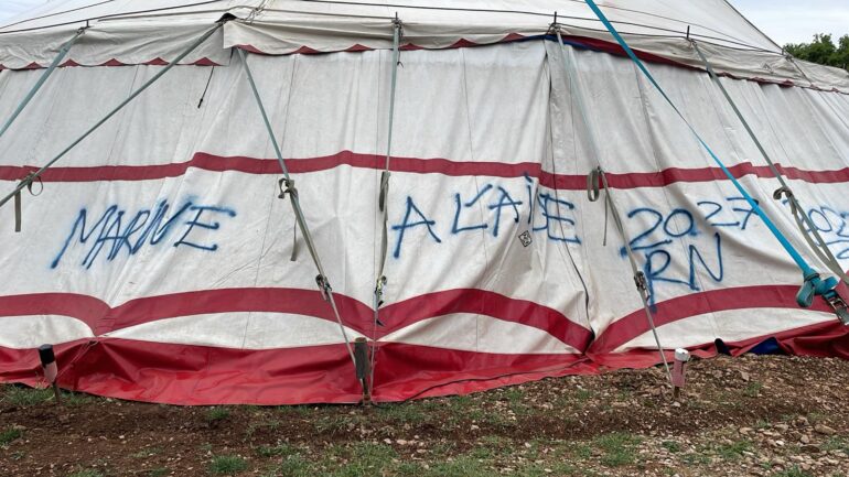 Le coup d’envoi de la 20ème édition du Chap Festival à Viols-le-Fort (Hérault) a été marqué par un acte de vandalisme. Dans la nuit précédent l’ouverture de l’évènement, entre le 22 et le 23 avril, un chapiteau a été recouvert de graffitis à caractère raciste et politique. Découverts au petit matin, ces messages comportaient notamment des insultes et des références à plusieurs courants politiques, parmi lesquels « Marine à l’aide », « Sale gaucho pue la pisse », « Zemmour », « Reconquête », « RN 2027 » ou encore « LFI tue ».