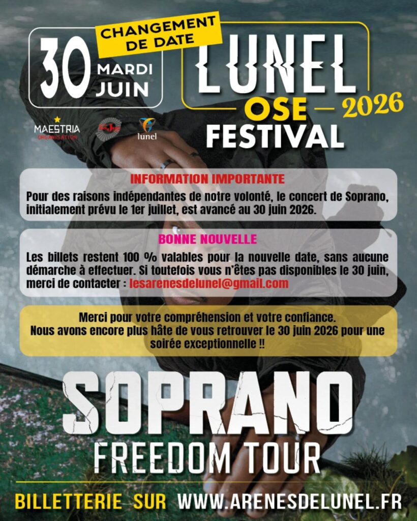 Les fans de Soprano devront ajuster leur agenda : le concert initialement prévu le 1er juillet 2026 dans le cadre du Lunel Ose Festival 2026 aura finalement lieu le 30 juin 2026. Bonne nouvelle pour les spectateurs : tous les billets déjà achetés restent valables pour la nouvelle date, sans aucune démarche à effectuer. Les organisateurs précisent cependant que ceux qui ne pourraient pas assister au concert le 30 juin peuvent se faire rembourser en contactant : lesarenesdelunel@gmail.com. Cliquez ici pour accéder à la billetterie.