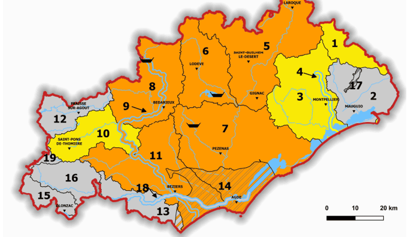 Le préfet de l’Hérault a donc décidé, au vu de ces paramètres ainsi que des prévisions météorologiques à court de terme, du maintien en alerte renforcée des bassins versants de l’Hérault, de la Lergue, de l’Orb (de l’amont à l’aval, y compris son axe soutenu), ainsi que de la nappe astienne. Egalement le maintien en alerte du bassin de la Mosson et du Lez (ainsi que son axe soutenu). De plus, les bassins versants du Jaur et du Vidourle sont rétrogradés en alerte. Les autres zones de l’Hérault sont maintenues en vigilance.