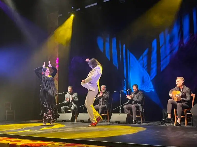 Avant que les deux danseurs émérites Karime Amaya et José Gomez Carmona « Rapico » ne fassent vibrer la foule, un hommage retentit. L’hymne de Valence résonne, des images de la ville défilent sur une grande toile blanche, les blessures sont encore vives suite aux terribles inondations en Espagne. Instinctivement, un premier convive se lève, puis un deuxième, puis c’est tout le public qui se retrouve debout, presque la main au cœur. Place ensuite au talentueux Pepe Fernández à la guitare, pour un hommage vibrant au guitariste Manitas de Platas qui, jadis, habita Lunel.