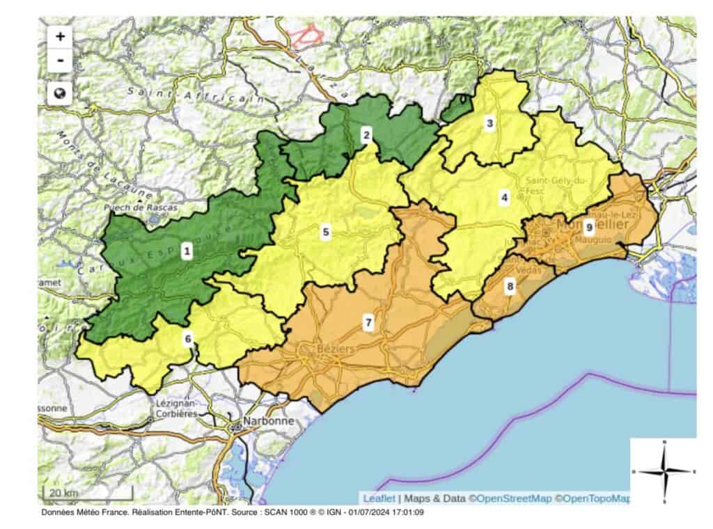 Trois secteurs du département de L’Hérault ont été placé en vigilance orange concernant les risques d’incendie pour cette journée du 2 juillet, contre un seul la veille :