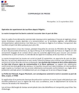Pour rappel, le 2 septembre 2022, 780 taurillons d’origine française embarquent dans un navire battant pavillon Togolais dans le port de Sète en direction de d’Algérie.