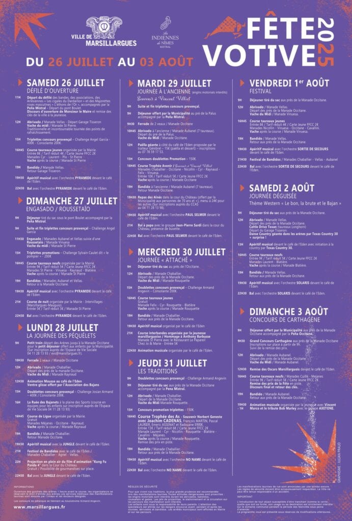 La commune de Marsillargues vivra au rythme de sa fête votive du 26 juillet au 3 août 2025. Au programme : abrivados, courses camarguaises, animations musicales, concours, journées à thème et ambiance festive pour petits et grands.