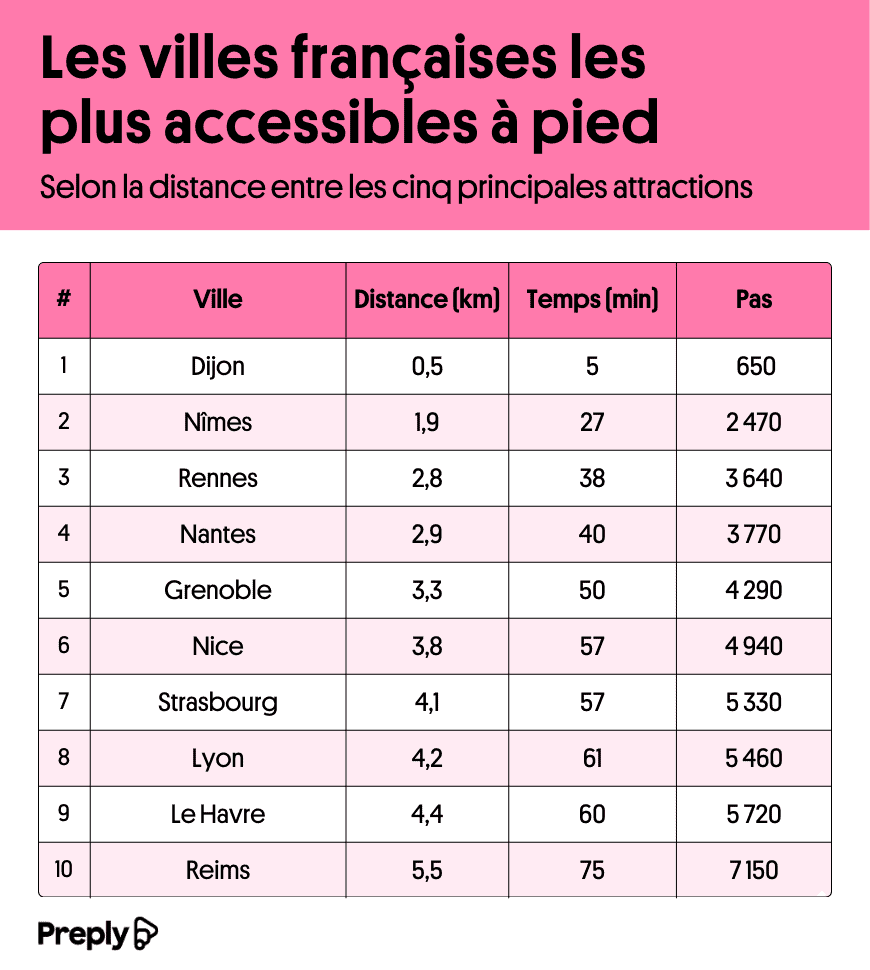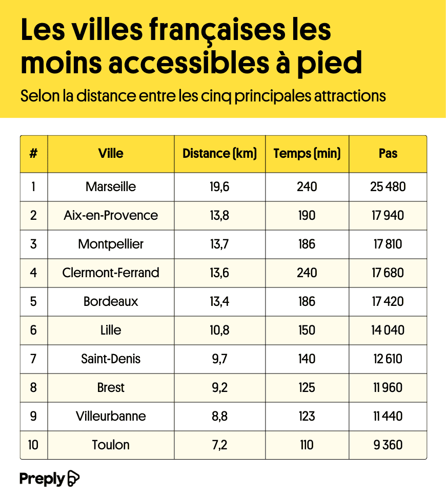 Afin de sélectionner les villes à analyser, Preply a pris en compte les principaux centres de population en France, aboutissant à une analyse de 25 villes au total. À partir de cette liste, TripAdvisor a permis d’identifier les cinq principales attractions touristiques de chaque ville, en se basant sur les avis des visiteurs. Pour chaque ville, Preply a utilisé le planificateur d’itinéraire de Google Maps pour déterminer le parcours à pied le plus rapide permettant de visiter les cinq attractions. Les distances et les temps de marche ont été enregistrés. Enfin, pour estimer le nombre de pas effectués, Preply a appliqué un taux de conversion de 1 315 pas par kilomètre, qui correspond à une longueur moyenne de pas de 76 cm.