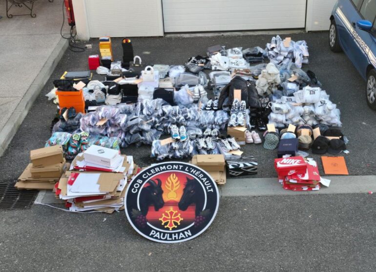 L’enquête a permis d’identifier un individu actif sur la commune de Clermont-l’Hérault, mais également sur l’ensemble du territoire national via Internet. Les produits mis en vente reproduisaient de grandes marques telles que Gucci, Hermès, Prada, Dior, Moncler, Nike ou encore Adidas. Il s’agissait notamment de chaussures, sacs, vêtements et lunettes tous contrefaits. Les investigations ont établi que cette activité illégale était exercée de manière régulière depuis mars 2023, après une première phase de revente de parfums contrefaits.