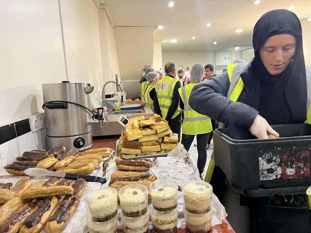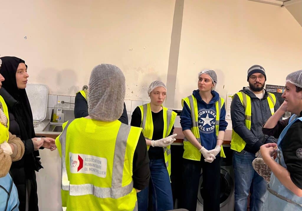 147 avenue de Boirargues, Montpellier. Une trentaine de bénévoles habillés de gilets fluorescents s’affairent avec entrain. Un formidable élan de solidarité calibré, où chaque bénévole est assigné à une tâche précise. En fond, une musique entrainante, le bruit des ustensiles de cuisine qui s’entrechoquent et les rires des bénéficiaires. Ces derniers viennent en nombre, patientent en devisant dans la file d’attente, afin de repartir avec une entrée, un plat, un dessert et une boisson.