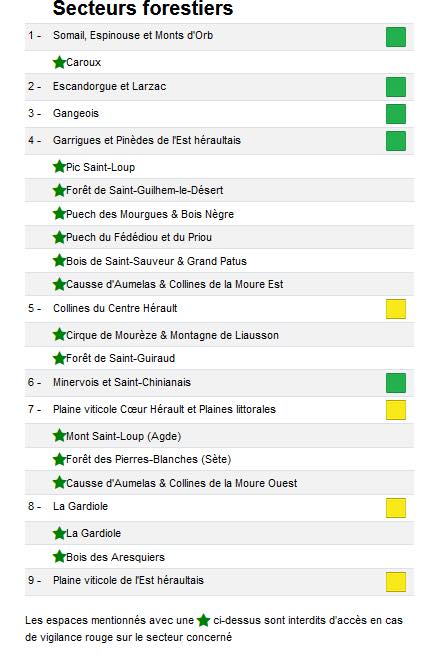 La préfecture rappelle les consignes : « Ne jetez pas vos mégots dans la nature ; ni feu, ni barbecue en zone boisée ; composez le 18 ou le 112 si vous constatez un départ de feu ». Pour tout connaitre sur le dispositif dans l’Hérault, la réglementation et la carte des 14 massifs qui fermeront en cas de vigilance rouge (risque très élevé) : urlr.me/uaghwB. Carte des secteurs de l’Hérault en risque incendie ci-dessous :