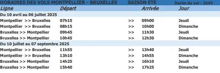 Deux vols par semaine, chaque jeudi et chaque dimanche, entre l’aéroport Montpellier-Méditerranée et Bruxelles-Zaventem vont être proposés dès avril 2025. Le premier vol est prévue de décoller le 10 avril 2025 à 7h15. Les billets sont déjà disponibles à partir de 36 € TTC l’aller simple sur le site de la compagnie Transavia. Les voyageurs vont embarquer à bord de Boeing 737-800 de 189 sièges.