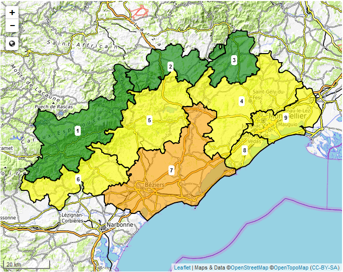 Un secteur du département de L’Hérault a été placé en vigilance orange concernant les risques d’incendie pour cette journée du 1er juillet. Il s’agit de la zone « Plaine viticole Cœur Hérault et Plaines littorales » allant du Biterrois au bassin de Thau. Le risque d’incendie y est élevé. Par conséquent, l’accès y est déconseillé et les travaux sont autorisés entre 5 heures et midi, sous réserve de dispositif de prévention et d’extinction.