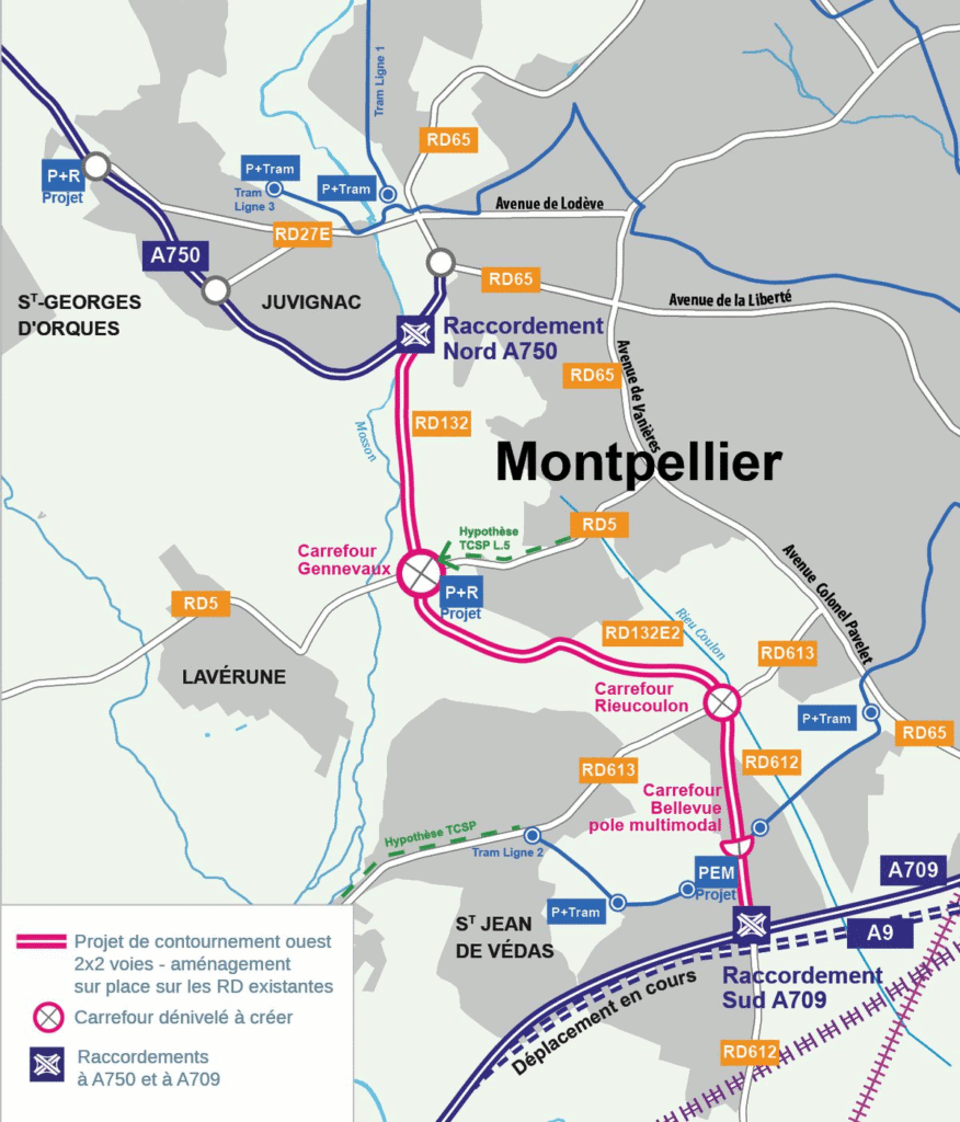 Le COM permettra de relier les autoroutes A709 et A750, et d’assurer une meilleure desserte de la zone urbaine de Montpellier depuis l’Ouest. Il consiste à réaménager en 2×2 voies, l’axe existant constitué de routes métropolitaines : RM132, RM132E2, RM612, RN109 et de carrefours giratoires, insuffisamment dimensionnées. D’une longueur de 6,2 km, le projet prévoit le réaménagement de l’échangeur avec l’A750 – RN109 au Nord, la création d’un nouvel échangeur autoroutier avec l’A709 au Sud et la modification des carrefours intermédiaires. Trois communes sont concernées : Juvignac, Montpellier et Saint-Jean-de-Védas. Quatre ouvrages d’art majeurs seront construits.