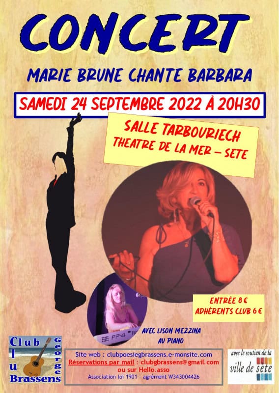 Marie Brune, auteur-compositeur-interprète, artiste bien connue de la scène sétoise, accompagnée de Lison Mezzina au piano, interprétera un choix de chansons de son artiste fétiche BARBARA. Sa voix chaleureuse vous emportera dans l’univers mystérieux et poétique de « la dame en noir ». Cette soirée est organisée par le Club Georges Brassens. Le concert se déroulera à la salle Tarbouriech, située au Théâtre de la Mer à Sète, sur la Promenade Maréchal Leclerc.