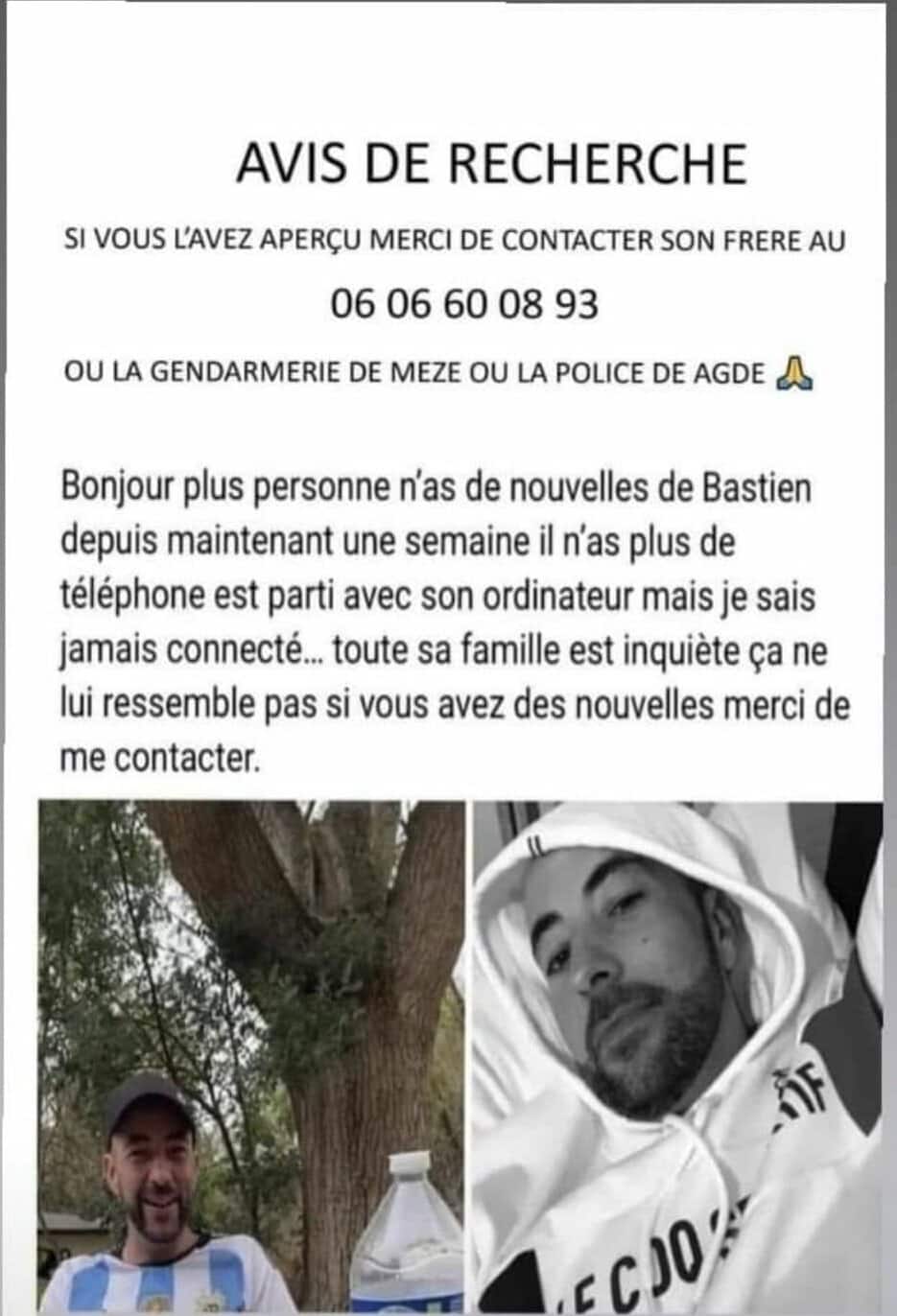 Bastien Permentier originaire de Mèze dans l’Hérault a disparu. L’homme ne donne plus signe de vie depuis le 22 août dernier. Il aurait été aperçu à Agde à cette date là.