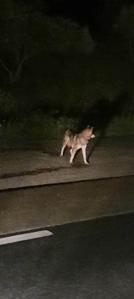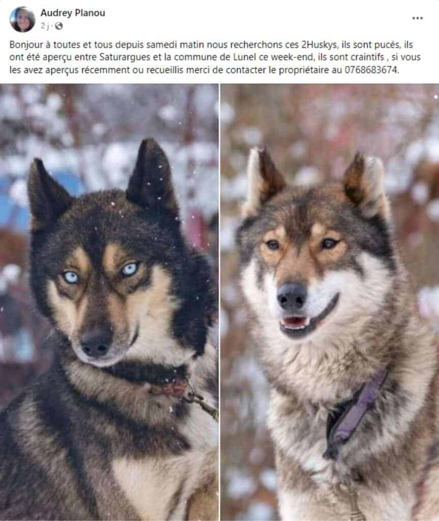 Est-ce véritablement un loup ? Ou plutôt un chien de race ressemblante physiquement ? La qualité des images ne permet pas de l’assurer. Toutefois, il pourrait bien s’agir d’un chien de race husky (celui de droite sur la photo ci-dessous). En effet, deux chiens de ce type ont été perdus dans le secteur depuis quelques jours.