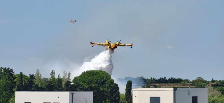 Alors qu’ils se rendaient sur les lieux du premier feu à Montouliers, les canadairs du SDIS 34 ont dû effectuer un largage du côté des jardins de Sérignan pour un nouveau départ d’incendie proche des habitations. Il s’agit du troisième départ de feu dans ce secteur en quelques jours seulement. Par la suite, les canadairs se sont de nouveau dirigés vers Montouliers et ont laissé le relais à des moranes.