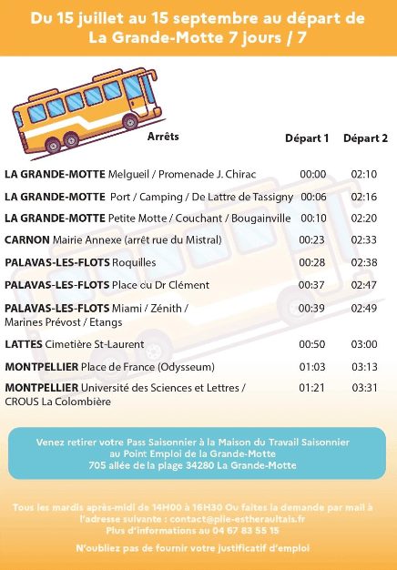 Cet été, du 15 juillet au 15 septembre, une ligne de bus nocturne et gratuite est mise en place entre La Grande-Motte et Montpellier, passant par Carnon et Palavas-les-Flots, dédiée aux travailleurs saisonniers.