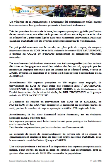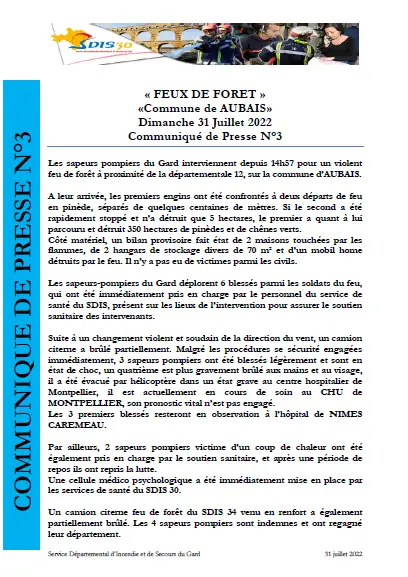 Selon le dernier communiqué officiel du SDIS 30 -Service Départemental d’Incendie et de Secours du Gard-, un sapeur-pompier a été grièvement blessé lors de l’incendie d’Aubais ce dimanche.