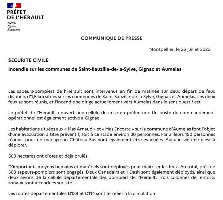 Des évacuations à titre préventif sur Aumelas son en cours. Près de 500 sapeurs-pompiers mobilisés sur les incendies. 2 canadairs & 1 Dash sont sur cet incendie. Les deux incendies se sont réunis pour ne former qu’un seul gros incendie. Le panache de fumée est visible à des kilomètres à la ronde.