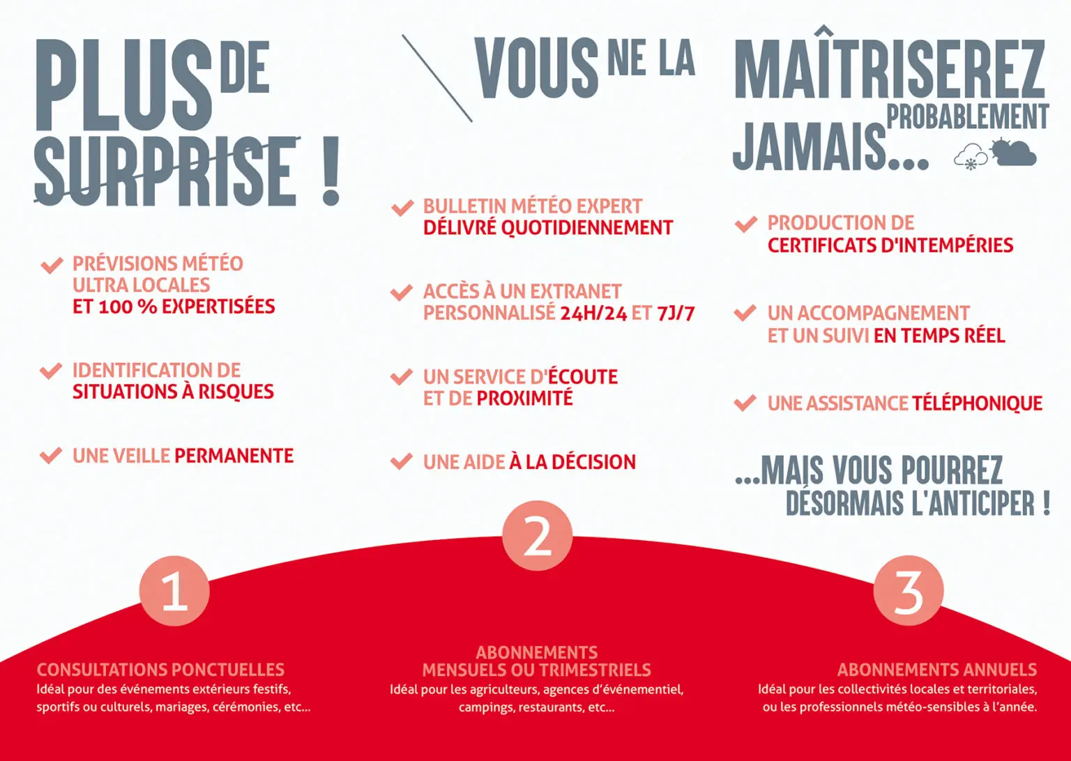 Les tarifs sont variable en fonction de la durée des prévisions et du type d’accompagnement souhaité. A titre indicatif, une consultation pour l’organisation d’un événement en extérieur est généralement facturée 50 € HT (en fonction de la durée de l’événement).