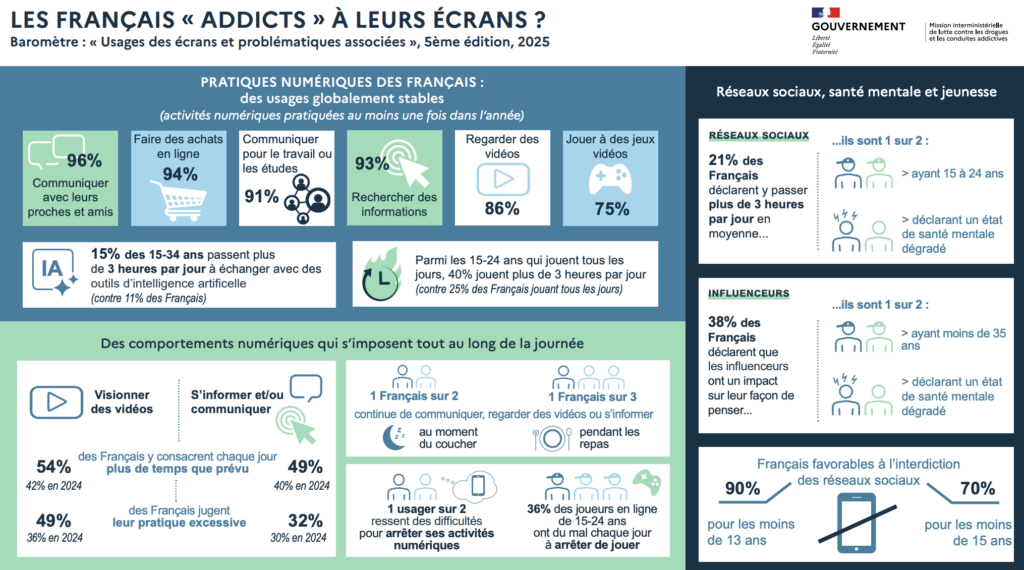 Les Français sont-ils dépendants de leurs écrans ? La Mission interministérielle de lutte contre les drogues et les conduites addictives (MILDECA), en partenariat avec Toluna Harris Interactive, a publié la 5ème édition de son baromètre sur les usages des écrans des Français. Cette année, le baromètre met en lien l’intensité des usages des réseaux sociaux et la santé mentale dégradée des Français.