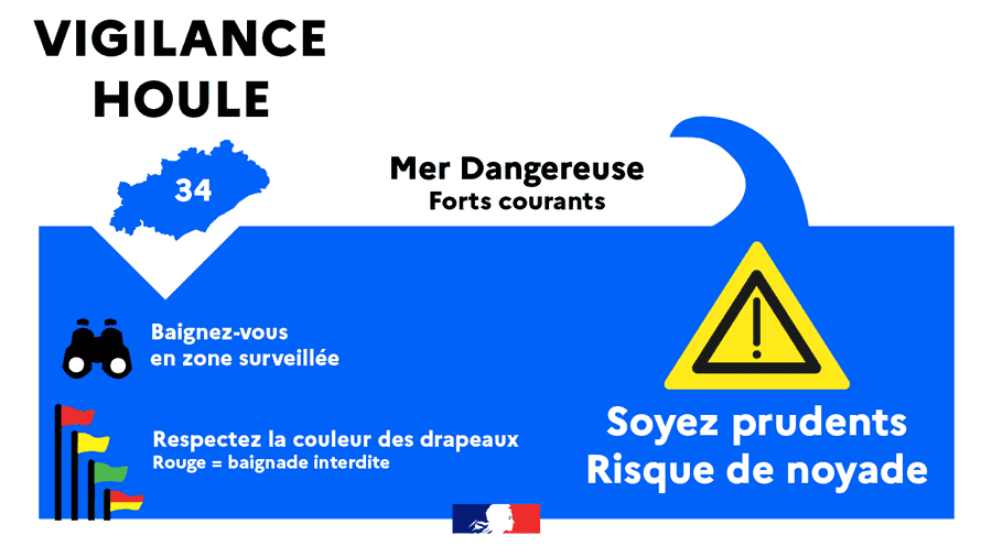 Le risque de noyade est réel. Privilégiez les zones surveillées et respectez les drapeaux mis en place. La houle sera aussi soutenue sur le littoral de l’Aude et des Pyrénées-Orientales. Elle devrait être moins forte du côté du Grau-du-Roi.