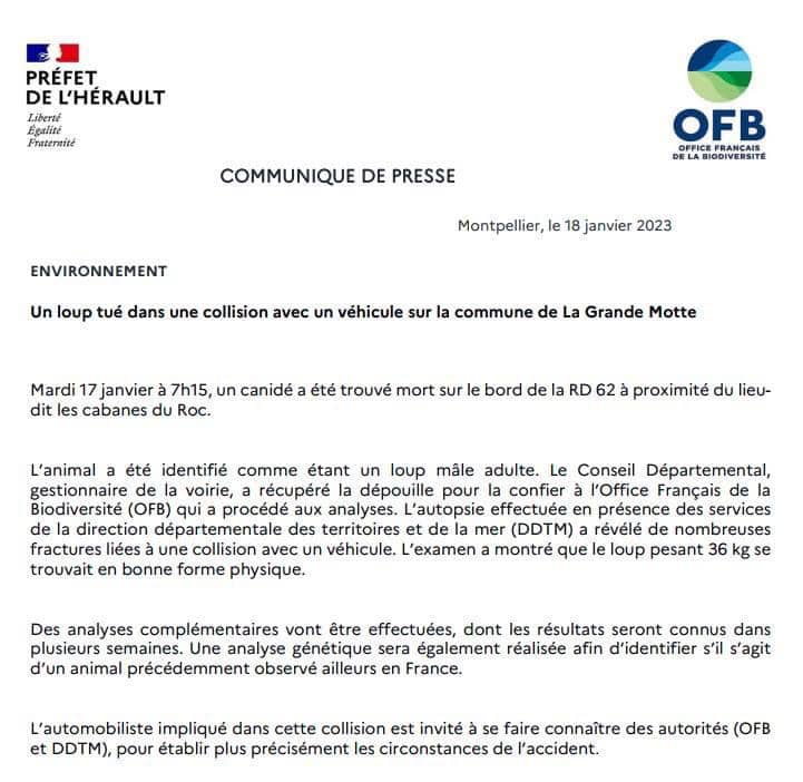 Nous vous en parlions ce matin : un loup a été retrouvé mort après une collision avec un véhicule sur la RD62, commune de LA GRANDE MOTTE, dans l’Hérault.