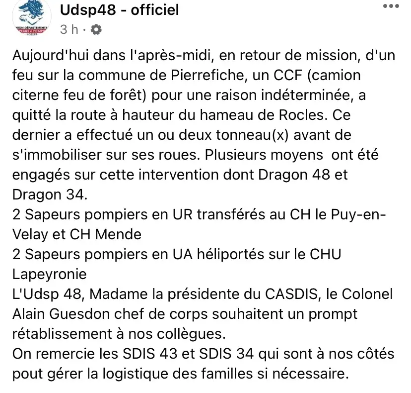 Pour des raisons encore méconnues, un camion citerne de lutte contre les feux, aussi appelé CCF, s’est retourné en effectuant un ou plusieurs tonneaux. 4 sapeurs-pompiers du SDIS48 ont été blessés, dont deux en état d’urgence absolue.
