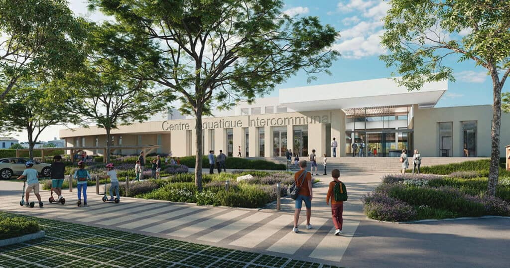 Ce futur complexe comprend 1 200 m² de bassins intérieurs et extérieurs, une pataugeoire, une aire de jeux, des terrasses et des locaux dédiés aux clubs. Zoom.
