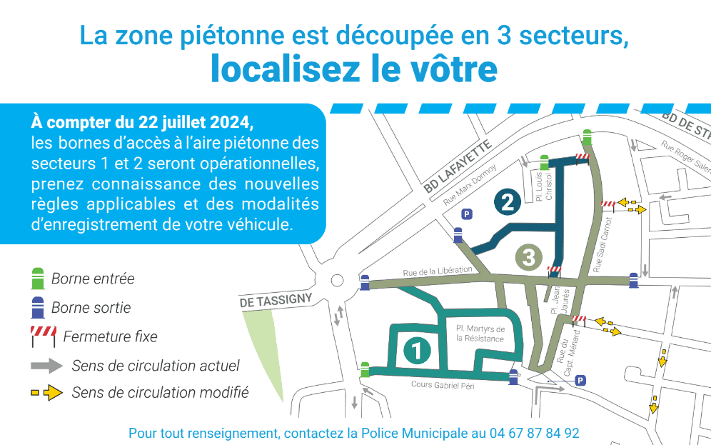 Désormais, les zones piétonnes sont divisées en trois secteurs. À partir du 22 juillet, les bornes d’accès seront opérationnelles dans les secteurs 1 et 2, tandis que le secteur 3 suivra le 1er juin 2025.