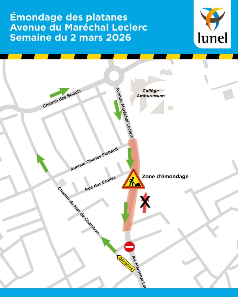 Plusieurs déviations sont mises en place. Les véhicules sortant de Lunel par l’avenue du Maréchal Leclerc sont déviés par le chemin du Mas de Chambon et le chemin des Bœufs en direction du rond-point Julius Estève. Puis, les véhicules entrant dans Lunel seront déviés sur la voie de circulation libérée.