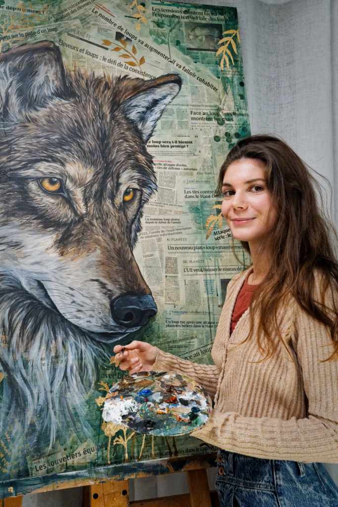 Face à la remise en cause du statut de protection du loup en Europe, Maëva présente une collection célébrant la beauté du sauvage et la nécessité de préserver ces espèces, comprenant peintures sur bois, illustrations naturalistes et tirages de son tableau phare. “Un regard sur l’avenir”, pièce maîtresse de la collection, est une œuvre engagée où Maëva a collé des articles de journaux sur le loup, envoyés par sa communauté sur Instagram, et peint par-dessus. Le tableau illustre la résilience de la nature : « malgré peur et incompréhension, le loup s’impose majestueusement, entouré de feuilles dorées symbolisant renaissance et espoir ». L’œuvre invite à réfléchir à la « protection des grands prédateurs, à la place que nous laissons à la nature et à notre capacité à coexister avec elle tout en appréciant sa beauté ».