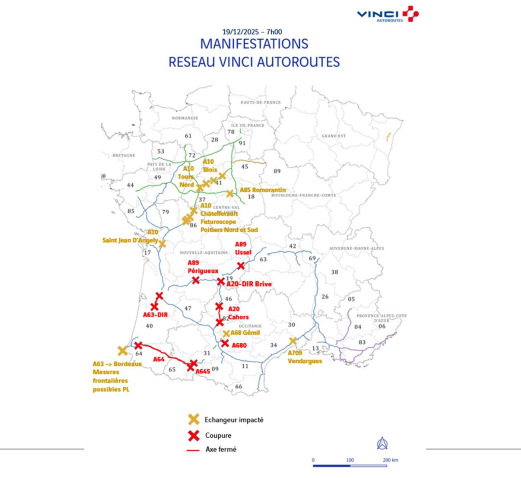 Ce vendredi 19 décembre, Vinci Autoroutes fait un point de situation à 7 heures. Suite aux manifestations des agriculteurs, « les blocages agricoles se poursuivent, notamment dans le Sud-Ouest, et perturbent fortement la circulation », affirme Vinci Autoroutes.