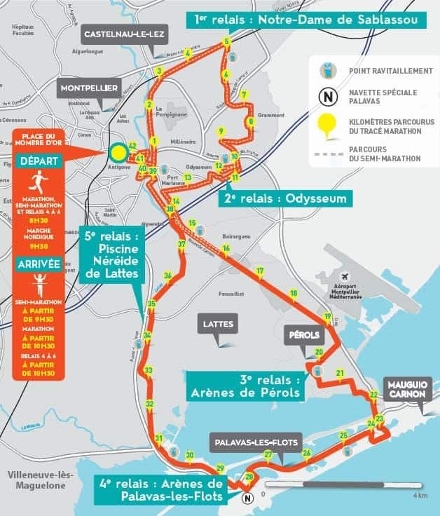 Le départ sera donné à 8h30, avec une arrivée prévue sur la place de Thessalie, dans le quartier Antigone de Montpellier. Les coureurs parcourront également les villes de Castelnau-le-Lez, Lattes, Pérols, Carnon et Palavas-les-Flots. En plus du marathon et du semi-marathon, il y aura également un marathon relais et une marche nordique.