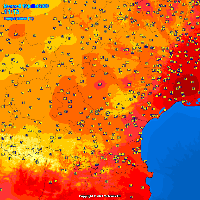 Pour preuve que les températures atteindront des niveaux très élevés cet après-midi, il fait déjà 33°C à Nîmes à 11h du matin. Au moment où l’on rédige cet article, on relève également 30°C à Sète et 32°C à Montpellier ! Ci-dessous, la carte des températures relevées par les stations météo en Occitanie à 11h13.