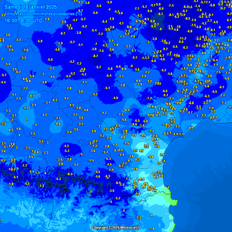 Pas de surprise. Les gelées se poursuivent en Occitanie. Les températures minimales relevées ce samedi 18 janvier au petit matin sont conformes aux prévisions météo. En plaine dans le Languedoc, il fait souvent de -3°C à -8°C ! Le mercure affiche de -6°C à -8°C en Gardonnenque dans le Gard, vers le Pic Saint-Loup dans l’Hérault ou encore du côté de la vallée de la Cèze. En Lozère, c’est de -10°C à -13°C que l’on relève sur l’Aubrac et la Margeride