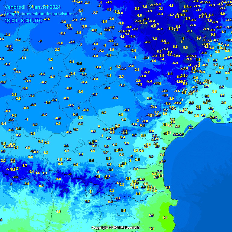 Comme prévu par nos bulletins météo, de petites chutes de neige ont concerné la Lozère entre jeudi soir et ce vendredi matin. Conjointement, les températures ont dégringolé et de fortes gelées se sont produites. Le mercure est descendu de -5°C à -10°C, comme en témoigne la carte des températures minimales ci-dessous.