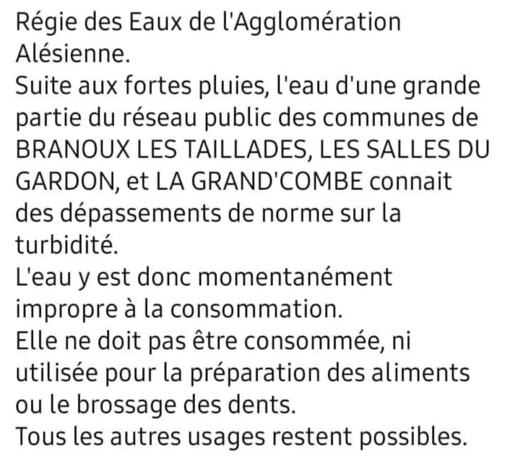 Dans les Cévennes et le bassin Alésien, l’eau est par endroit impropre à la consommation. C’est le cas à Branoux-les-Taillades, les Salles du Gardon et à La Grand Combe.