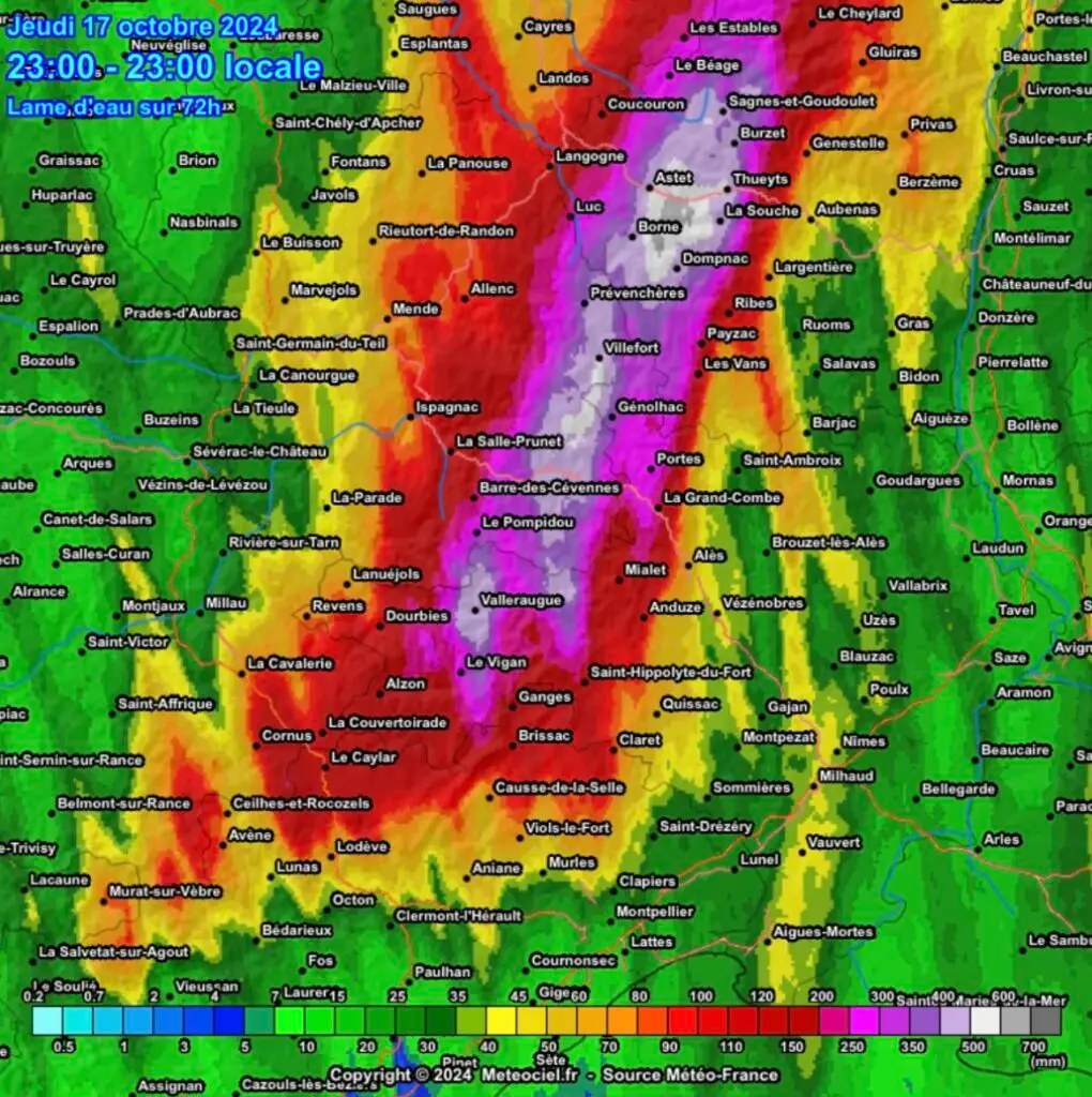Les cumuls de pluie dépassent les 750 mm en Cévennes, notamment sur l’Ardèche dans les environs, de La Croix de Bauzon. Les précipitations s’étendent même en dehors de l’axe cévenol, aux départements de l’Auvergne-Rhône-Alpes où une vigilance rouge est également en cours. Des crues majeures et importantes des cours d’eau sont en cours, notamment l’Ardèche et ses affluents. En Lozère, tous les cours d’eau sont aussi en crue et provoquent des inondations. Evitez de vous déplacer dans le secteur cévenol jusqu’à ce vendredi.