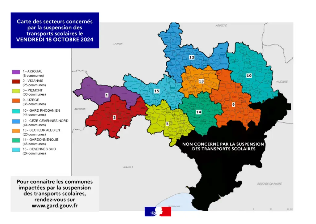 De nouveaux orages se forment dans le Roussillon et en Méditerranée. Certaines remontent vers le Narbonnais et le Biterrois. Dans le même temps, d’autres cellules circulent sur les hauts-cantons héraultais en direction de l’Aveyron. En Cévennes et en Lozère, les précipitations perdurent encore et encore… 300 personnes ont été évacuées à Pont-Saint-Esprit en raison de la crue du Rhône en cours et 9 personnes ont été secourues par les sapeurs-pompiers. Celle-ci se propage lentement en aval vers Avignon et Beaucaire ce soir et cette nuit. Le Préfet du Gard informe que les transports scolaires sont suspendus ce vendredi 18 octobre dans le Nord du Gard. Voici la carte communiquée à 17h, où étrangement, les secteurs de la vallée du Rhône ne sont pas concernés…