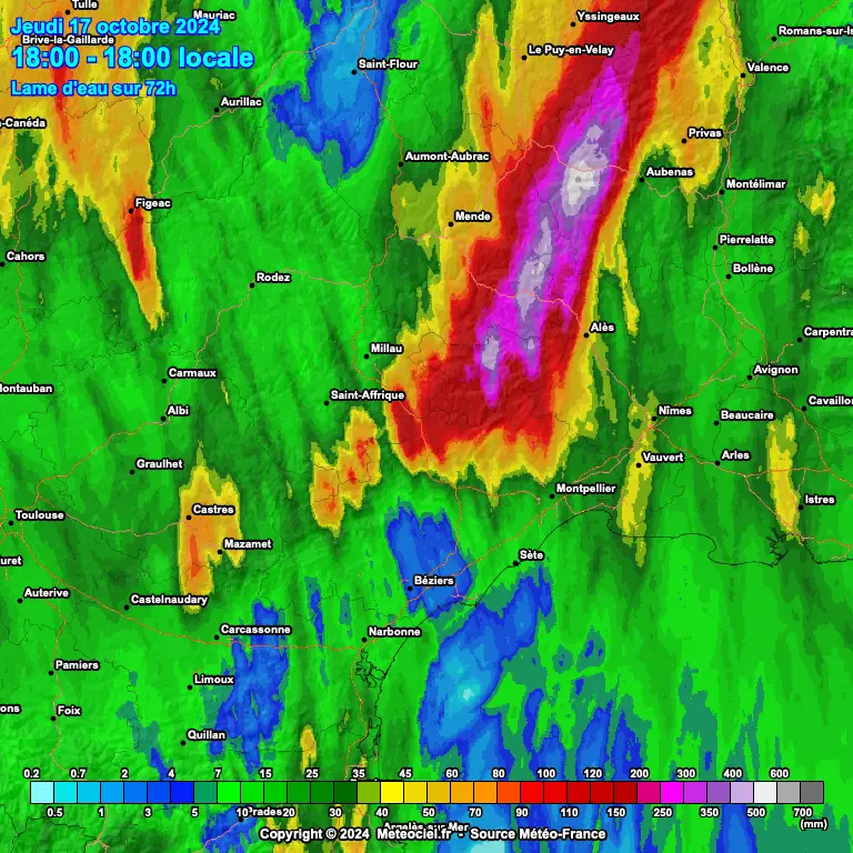 L’épisode cévenol est terminé dans le Languedoc, les Cévennes et l’Ardèche. Les précipitations perdurent sur l’Ouest de l’Occitanie et dans le Midi-Toulousain. Il est tombé près de 700 mm en 48h à Mayres en Ardèche et on a élevé jusqu’à 850 mm à La Croix de Bauzon. Cet épisode cévenol s’avère exceptionnel en terme d’intensité. On fera un bilan complet demain vendredi. En attendant, soyez prudents cette nuit près des cours d’eau notamment à Beaucaire où le Rhône atteindra son pic de crue d’ici la fin de nuit. Merci pour votre fidélité et votre confiance ! Bonne nuit.