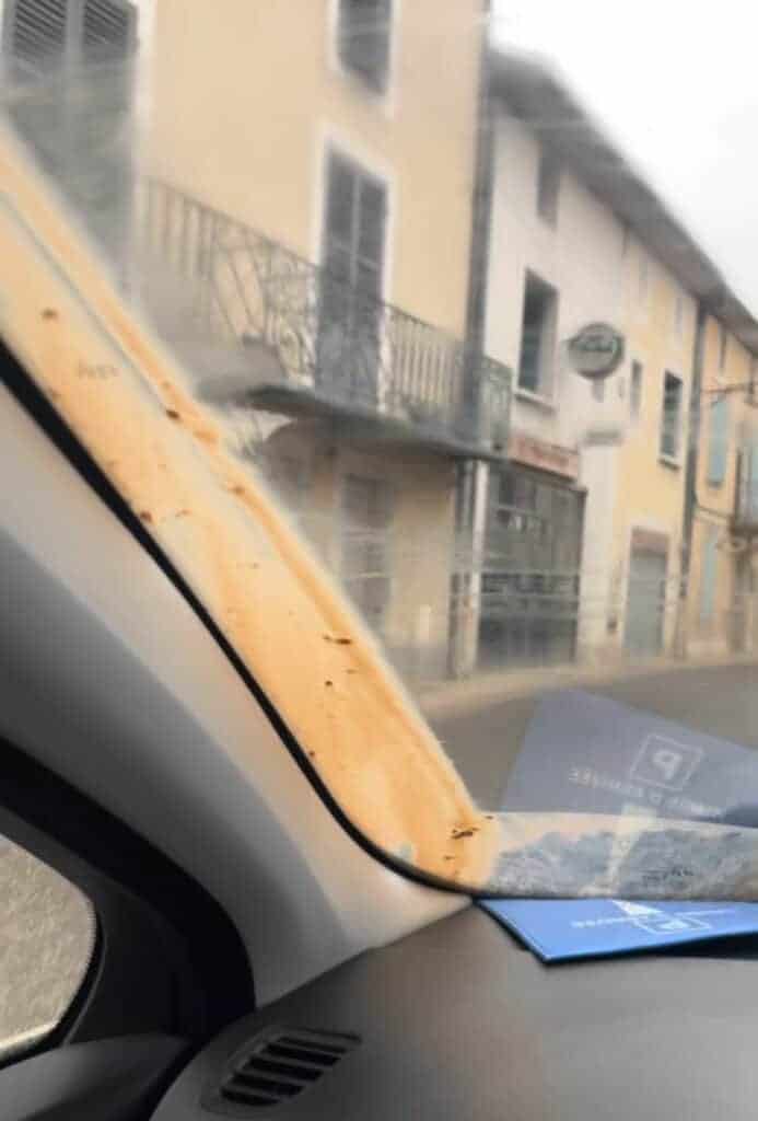 En conséquence, les pluies qui se produisent ce samedi matin entre l’Est de l’Hérault, le Gard, les Cévennes, la Lozère et la vallée du Rhône sont sableuses. Ce sable se dépose sur toutes les surfaces. Particulièrement sur les véhicules, les terrasses, les mobiliers de jardin ou encore sur la végétation.
