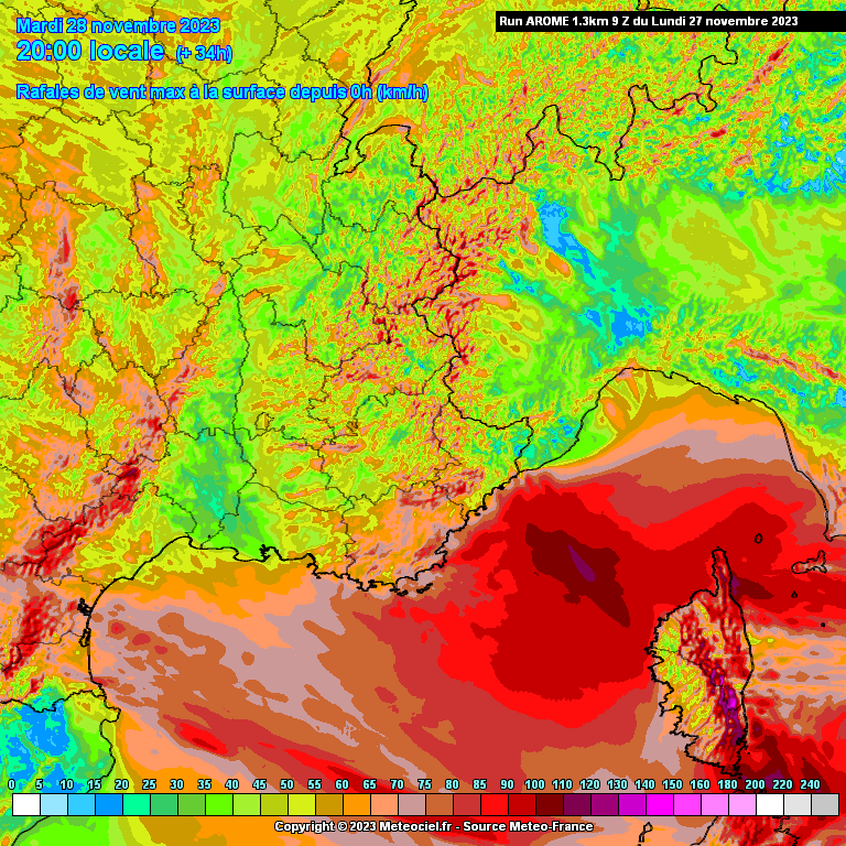 Les rafales avoisineront les 60 km/h du côté de Béziers et de Sète, 70 km/h de Narbonne à Perpignan. Sur les hauts cantons et les reliefs, le vent atteindra de 80 à 100 km/h en rafales, voire 120 km/h du côté de l’Aigoual notamment.